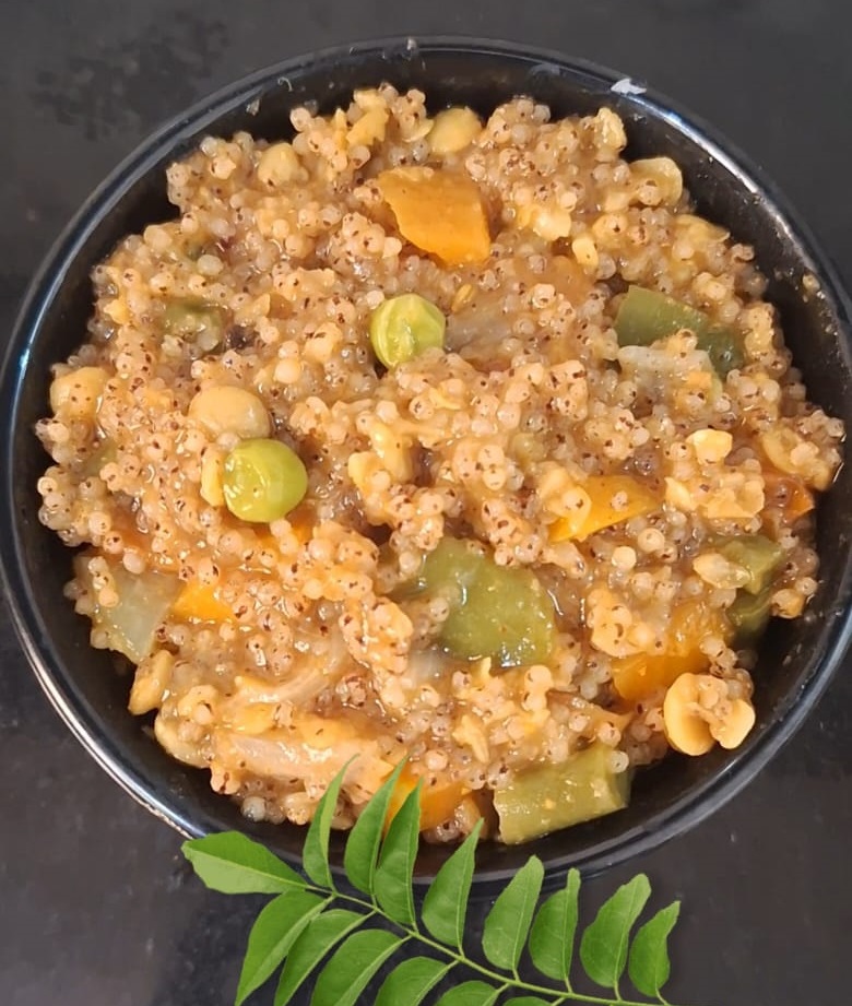 A hearty, fiber-rich upma made with Ragi Rava, mustard, green chilies, ginger, curry leaves, and mixed vegetables.